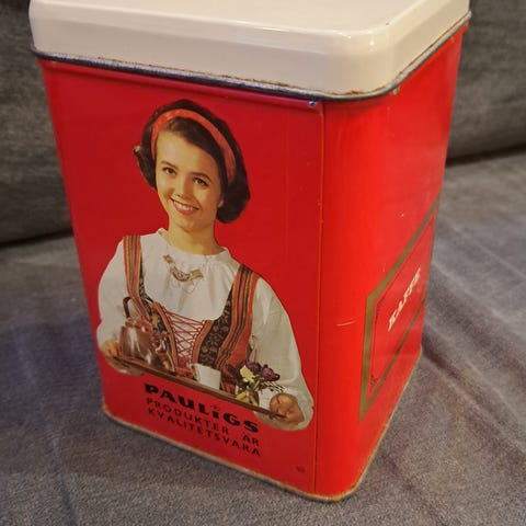 Peltinen Paulig kahvipurkki, aika tehnyt tehtävänsä patinoinnin suhteen, punainen väri muuttanut osin värinsä tyylikkään kellertäväksi.