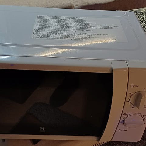 Myydään mikroaaltouuni ja suojakupu. Lämmittää hyvin, mutta avausnappi kanittaa välillä. Ei haittaa käyttöä.