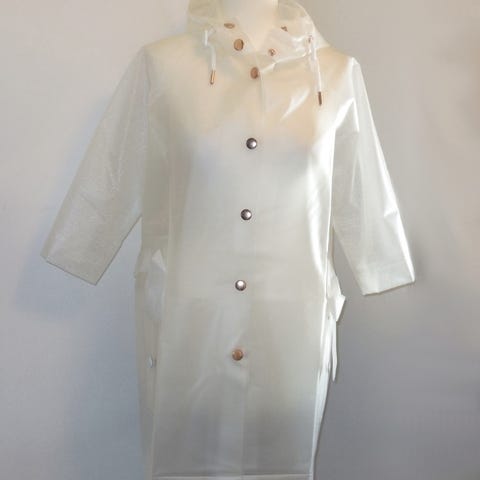 Musta trenssitakki napituksella ja kaksisuuntaisella vetoketjulla. Irroitettava vyö. Koko L, vastaa ennemmin kokoa M. Ovh 199.