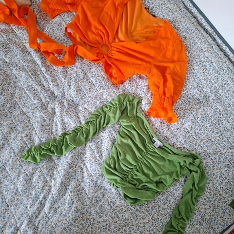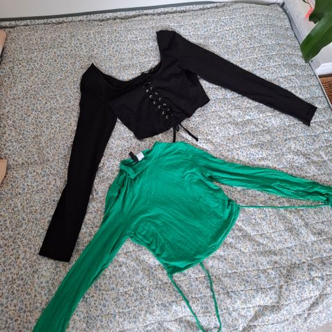 Valkoisia croptoppeja, yksi värikäs (S-M kokoiselle). Kreppikankainen löysä paita (5€) vyöllä menee varmaan XL asti istuvuus preferenssistä riippuen.