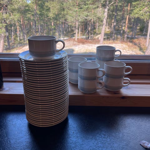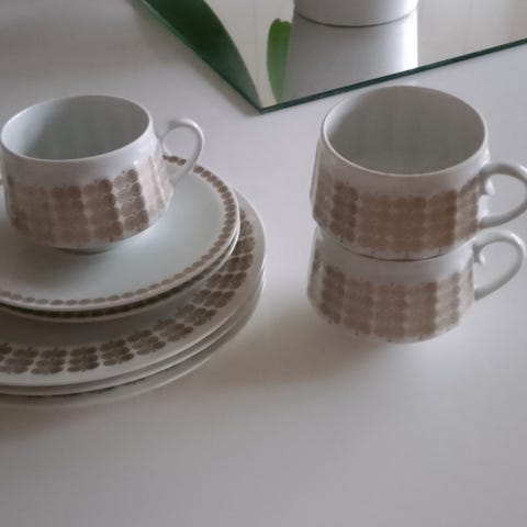Arabia Pallas kaunis vintage kahviastiasto 1970-luvulta. 6 kpl hyväkuntoisia, ei juurikaan jos olleenkaan käytetty, kahvikuppeja, asetteja ja kahvileipälautasia. Design Raija Uosikkinen.