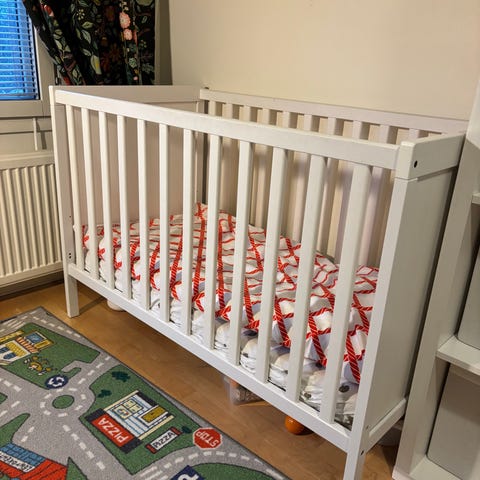 Ostettu käytettynä kolme vuotta sitten, edelleen hyvässä kunnossa. Yksi laita irrotettava, saa muutettua juniori-sängyksi.