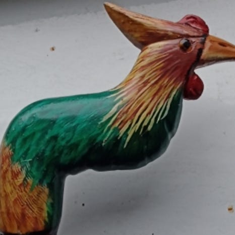 Kaunis käsintehty puinen kävelykeppi, jossa on yksityiskohtaista puukaiverrusta.