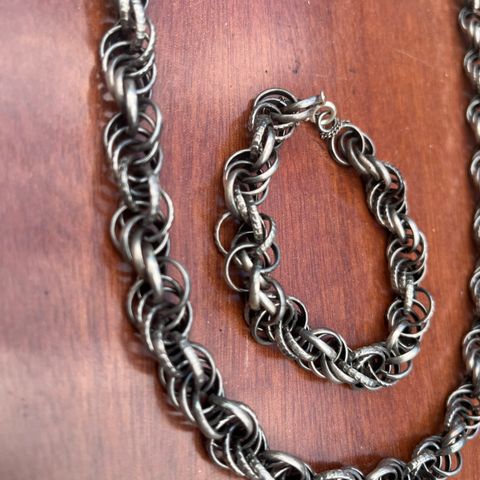 Upea hopeinen Kalevala Korun Setukaisen kääty -setti, johon kuuluu kaulakoru, korvakorut sekä rannekoru. Massiivisessa käsin punotussa ketjussa sileät ja kuvioidut renkaat vuorottelevat viiden sarjoissa ja yhdessä korun sileistä renkaista löytyy pitoisuus-, valmistaja- ja vuosileimat. Kaulakorun pituus 70 cm, korvakorujen pituus 5,5 cm koukun kanssa ja ranneketjun pituus 19 cm (rannekorussa on turvaketju), ketjujen leveys noin 1 cm. Tämä myydään ensisijaisesti vain settinä ja se tulee 9x9 cm rasiassa. Tämän upean kokonaisuuden voit antaa vaikka lahjaksi tai itsellesi juhlakäyttöön. Nouto tai postitus (kulut ostajalle). Tarjoa!