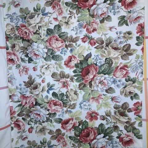 Suora sivuverho (1 kpl) isoilla ruusukuvioilla ja kitin värisellä pohjavärillä. Materiaali pellavaa. Pituus 250 cm ja leveys 125 cm. Verhon yläreunassa 3 cm levyinen verhonauha verhokoukuille (ripustus onnistuu myös perinteisillä verhonipsuilla).