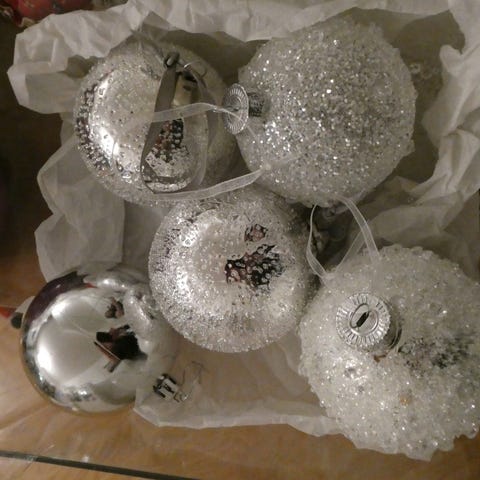 Neljä muovipalloa, joiden sisällä talvinen maisema, kuusi ja peura.