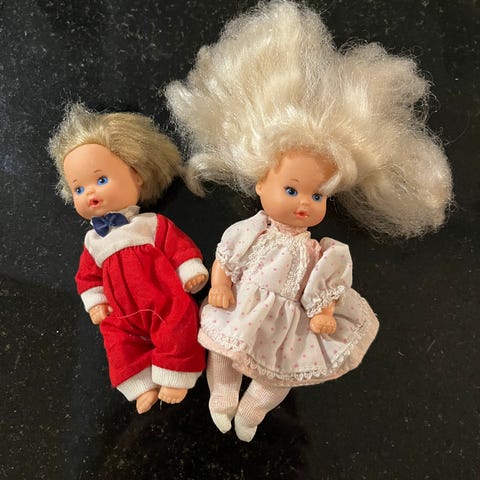 Miehen vasen käsi on lommoilla ja naisen nenä myös. vaatteet ovat sekalaisia mutta niitä on paljon. 1958-1960 luvun nuket.