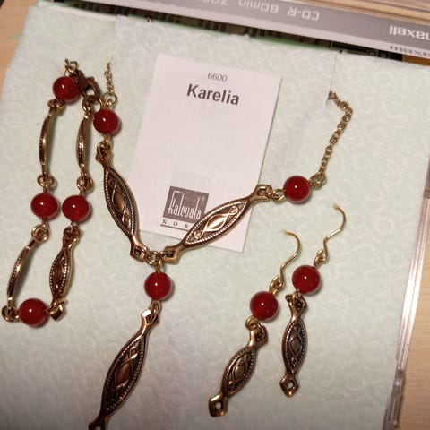 Kaunis ajaton Kalevalan Karelia kaulakoru pronssisena. Punaisilla helmillä koristeltu. Ketjuosa 32 cm ja koruosien korkeus 9 cm.