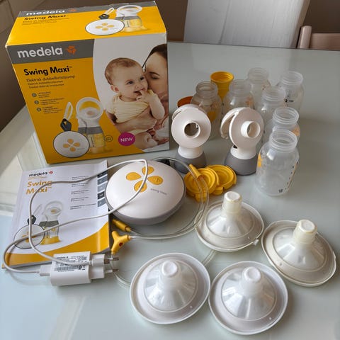 Medela Swing Maxi Flex rintapumppu setti sisältää sähköisen rintapumpun, useita rintakuppeja ja muita tarvikkeita. Setti on suunniteltu imetyksen tukemiseen ja maidon pumppaamiseen. Mukana on myös virtalähde ja ohjekirja.