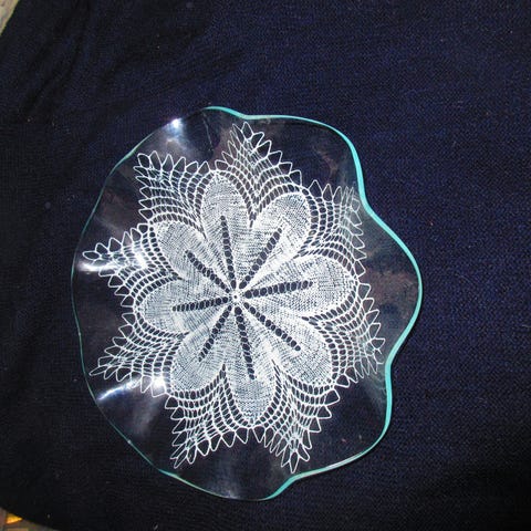 Kumelan käsinmaalattu tarjoiluvati, sonertävää lasia, 1930-luvulta edustaen funkkiksen parhaimmistoa maassamme, hyväkuntoinen