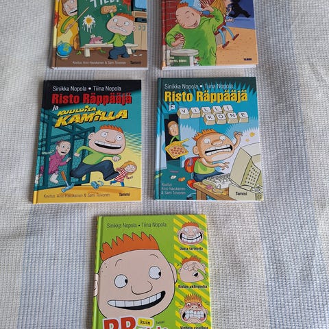 Risto Räppääjä -kirjasarjasta, kaksi kirjaa myynnissä, kirjoittanut Sinikka Nopola ja Tiina Nopola. Sarjaan kuuluu useita lastenkirjoja, joissa seurataan Risto Räppääjän seikkailuja ja ystävyyssuhteita.
