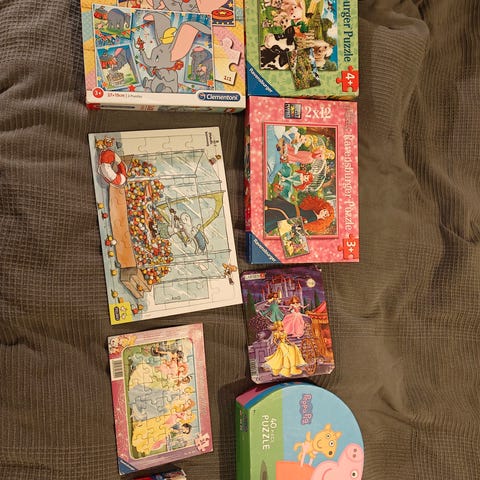 Kaikki palapelin palat tallessa ja ne ovat ehjät (muutamissa palapelinpalassa kulumaa reunoissa, katso kuvat). Paketissa lukee, että mukana tulee Herra Apinamie-hahmo, sitä ei tule mukana (kadonnut vuosien varrella).