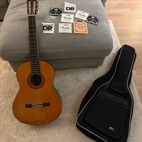 Yamaha C40 akustinen kitara, musta väri. Kitara on valmistettu puumateriaaleista ja soveltuu akustiseen soittoon. Sopii eri tasoisille soittajille.