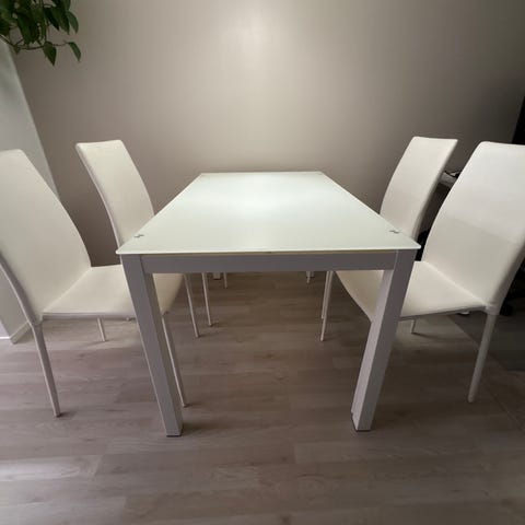 Maskusta ostettu kahden hengen lasinen ruokapöytä.