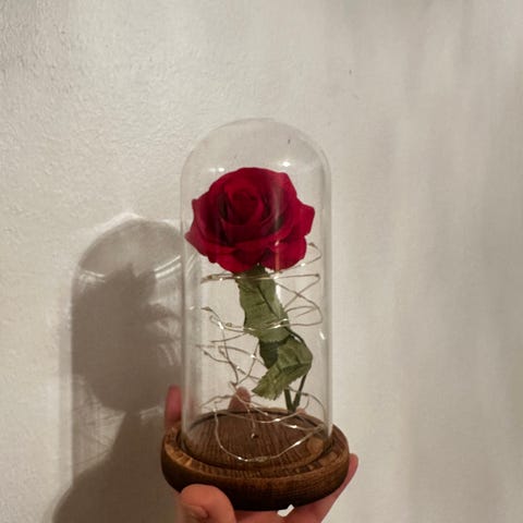 Myydään pinkki ruusu ja pieni maljakko. Ruusu 20 euroa, maljakko 5 euroa