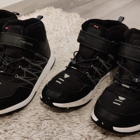 Mustat Vikingin vedenpitävät välikausikengät. Koko 39. Uutena ostettu, yhdellä käyttäjällä olleet. Siisti ja ehjät. Pesty kerran myyntiä varten.