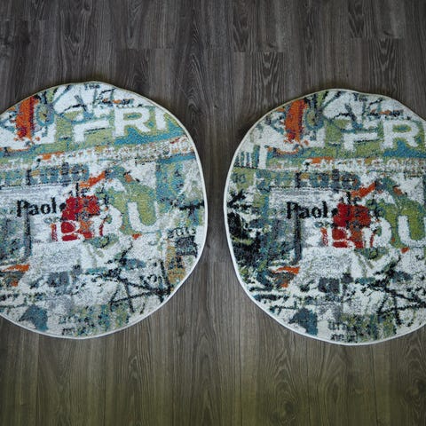 Käytetty mutta hyväkuntoinen pyöreä ontelokude matto. Musta pinkki valkoinen.
