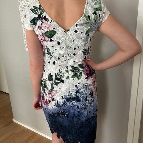 Ted Baker juhla- tai cocktailmekko naisille, koko 1. Mekossa on kirjava kukkakuviointi , Mekon malli on vartalonmyötäinen, ja siinä on vetoketju takana. Mekko sopii juhla- ja cocktailtilaisuuksiin. Ollut päällä yhdet juhlat