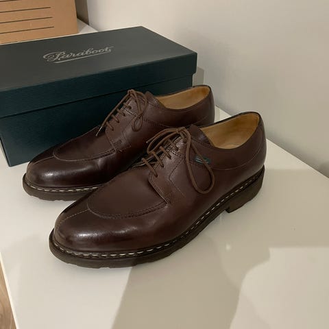 Myyntiin varsin hyvässä kunnossa olevat Paraboot Reims loaferit ruskean sävyssä Lisse Café. Norwegian welt ja pitävä pohja tekevät näistä talvikelien parhaat loaferit. Kenkiin on laitettu ohuet tongue padit Caine Clothiersin Johanin toimesta. Malli on muuten melko korkea/rintava ja tongue padillä kantapään liukumisen sai hyvin hallintaan. Kantakupit ovatkin erinomaisessa kunnossa.