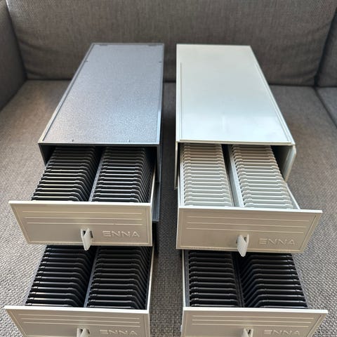 24x36 dioille 5 kasettia eli tila 500 dialle. Koteloille voi löytää muutakin arkistokäyttöä. Tampereella nouto.