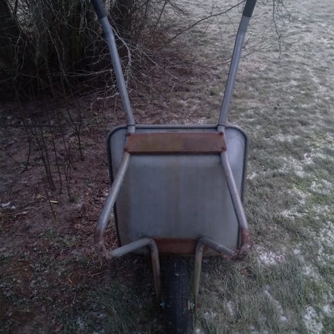 Rautaiset kottikärryt, pinta ruosteenvärissä, mutta täysin ehjät. Umpikuminen rengas melkein uusi.