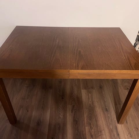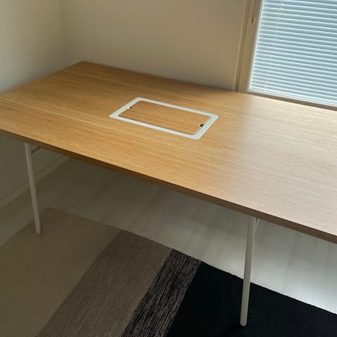 Myydään Ikean pöytä. Puinen pöytälevy ja metalliset jalat. Yleisilme siisti, joitakin tummentumia pinnassa.