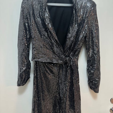 Mekossa on paljettipinta ja vyötäröllä solmittava vyö.