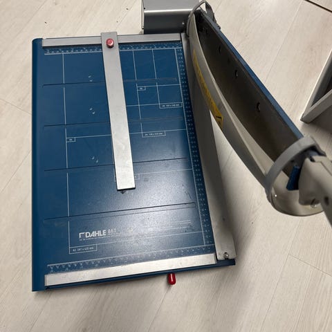 Rowe 59 paper cutter leikkuupöytä, jossa on pitkä leikkuupinta. Väri vaalea harmaa ja punainen leikkauskahva. Sopii paperin ja muiden materiaalien tarkkaan leikkaamiseen. Vankka metallirunkoinen malli, joka on suunniteltu kestämään teollista käyttöä.