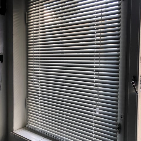 Kesällä Jyskistä ostetut alumiiniset valkoiset sälekaihtimet. Kunto kuin uusi muuten, mutta yhdessä säleessä pieni kupru, näkyy kuvassa!