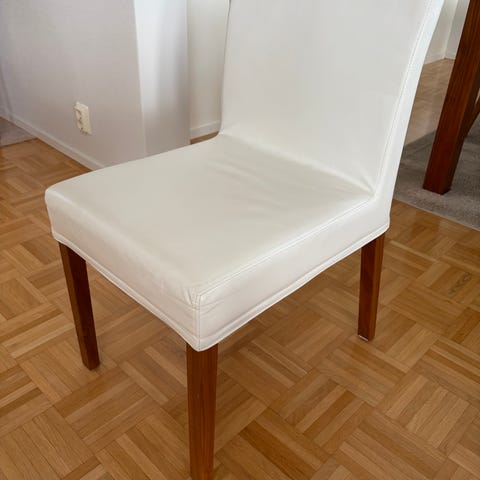 Tuoleihin saa halutessaan tilattua vaihtohuppuja Kaanin verkkokaupasta. Tuolien mitat näkyvät myös kuvissa. Tuolien ovh-hinnan voi googlata, eli tällä hinnalla ei saa edes yhtä uutta nahkaverhoiltua tuolia.