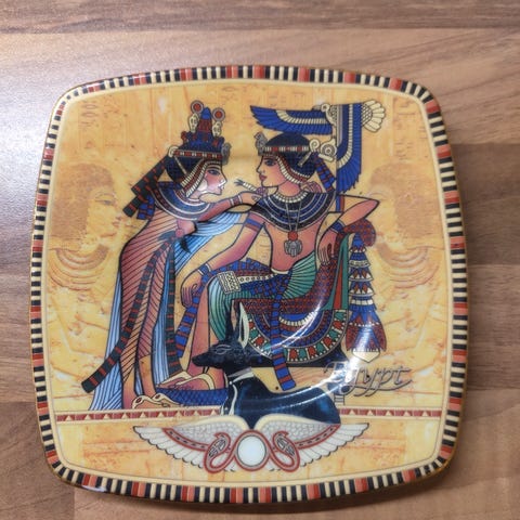 Port Saidista 1976 hankittu kovapuinen koristelautanen. Helmiäis- ja luuintarsiaa. Yksi luun pala puuttuu reunasta, muuten kunto tosi hyvä. Halkaisija 35 cm. Lähetettäessä postituskulut.