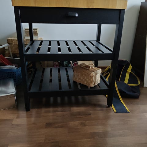 Ikeasta ei enää saatavilla, mutta kovasti suosiossa oleva saareke. Pöytälevy tammea. Toisella puolella kaksi metallista hyllyä, toiselta puolelta avointa tilaa esim baarijakkaroita varten. Haku Rastilasta.
