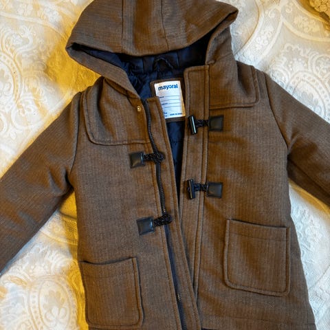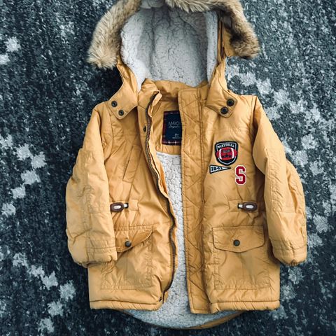 Lämmin osittain untuvatakki (lapun olen leikannut pois, niin en muista tarkkaa määrää untuvasta). Muuten hyväkuntoinen, mutta hupun yksi neppari ei pysy kiinni (kuva), joten olen laittanut langalla kiinni. Käytössä ei näy eikä haittaa