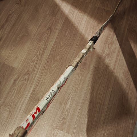 Myyntiin Jussi Olkinuoran maila Suomen MM-kisoista 2022 jossa hän pelasi ykkösmaalivahtina ja suomi voitti MM Kultaa. Lapa murtunut pelissä ja laitettu kirkas teippi murtuman päälle.