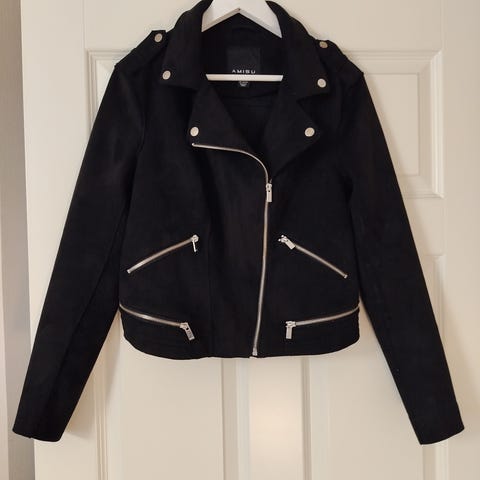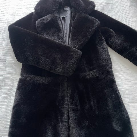 Myydään kuvan lämmin kaunis AMISU merkkinen musta hupullinen tekoturkistakki.