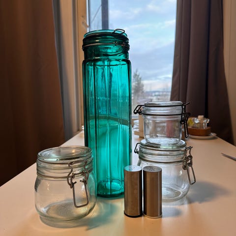 IKEA lasipurkit eri kokoja, kirkas lasi. Soveltuvat säilytykseen keittiössä tai muussa kodin tilassa. Purkit ovat läpinäkyviä ja niissä on tiivis kansi.