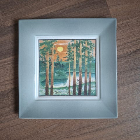 Mielestäni pohja-materiaali on fajanssia, etupuoli on lasitettu. Tekijän signeeraus on vasemnassa alakulmassa.
