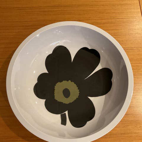 Klassinen Marimekon Unikko-kuosinen suuri salaattikulho, melamiinia. Sininen unikko valkoisella pohjalla. Ei enää valikoimissa. Läpimitta 30,5 cm, korkeus 8 cm.