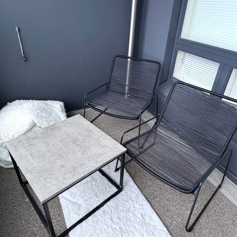 Terassiryhmä jossa kaksi tuolia ja pyöreä pöytä. Muutama vuosi sitten Maksusta ostetut, nyt myyntiin muuton takia.