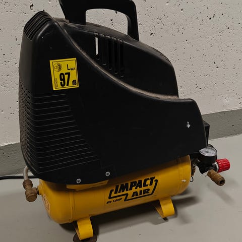 Siitä toimiva laite seuraavaan tallin nurkkaan, kompressori isolla säiliöllä ja 2-sylinterisellä puristimella.