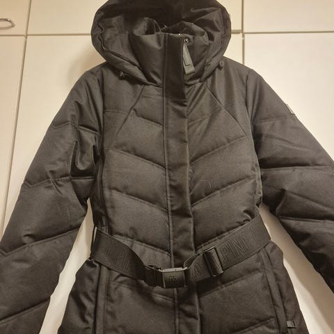 AMISU Talvitakki mustassa värissä, naisten koko M (36). Takki on valmistettu lämpimästä materiaalista, jossa on paksu toppaus. Siinä on pitkät hihat, joissa resorikahvat sormille, sekä vetoketju- ja nappikiinnitys edessä. Takissa on irrotettava huppu, joka kiinnittyy napeilla. Soveltuu käytettäväksi kylmillä säillä.