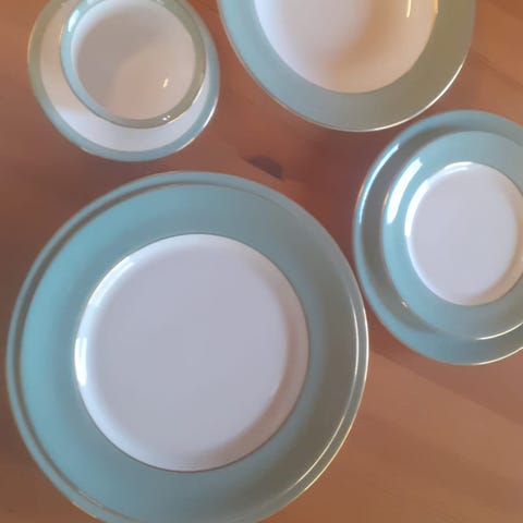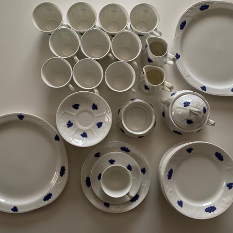 Kaunis, klassinen Blå Blom astiasto luuposliinia, Old Gustavsberg. Benporslin VDN-B555. Astiasto on lähtöisin suoraan Gustavsbergin tehtaalta, ostettu 1960- tai 1970-luvulla.