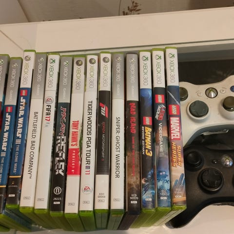 Kuvanmukainen setti, käytönjälkeä löytyy kaikesta, ohjaimesta on akku loppu ja en löydä latauskaapelia, joten en pysty testaamaan alkuruutua enempää valkoista konetta, jokainen peli on laitettu koneeseen ja lukee ainakin levyn, levyistä löytyy kaikista jälkeä, konsolissa jälkeä jonkun verran