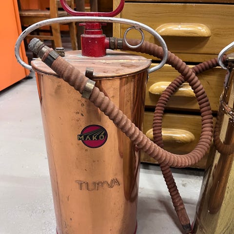 Vanha pumppaustoiminen ja messinkivalmisteinen Turva-sammutusruisku. Kumiosat (tiivisteet & letku) hapertuneet, joten nykyisessä kunnossa lähinnä somisteeksi tai fiksaajalle rojektiksi.