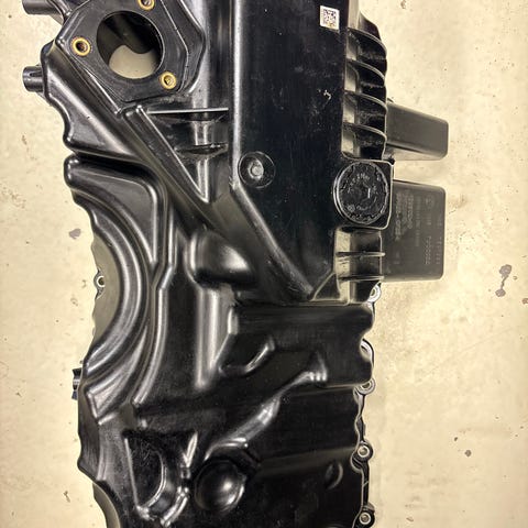 Bmw N20B20A Moottorin suoja. Kannessa on alipainesäiliö, mutta sen letkulähdöt ovat rikki/liimattu. Korjattavaksi tai alipaine säilliön irrottamisen jälkeen uudempaan moottori malliin, jossa ei ole alipaineella ohjattua hukkaporttia.