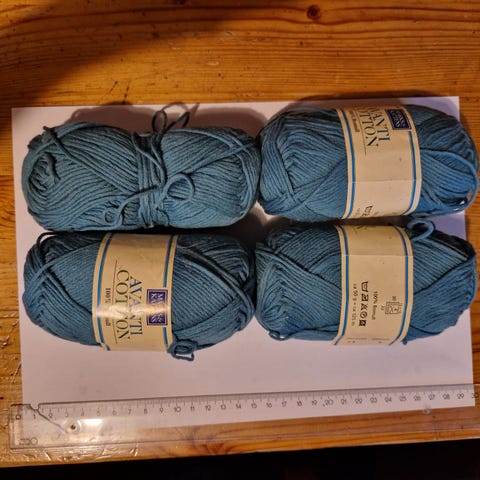 Novita Cottonella puuvillalanka, 50 gramman kerä, väri luonnonvalkoinen ja sininen. Soveltuu neulonta- ja virkkaustöihin, valmistettu puuvillasta (54% ja 46 akrylia). Pussi sisältää 4 kokonaista kerää ja avattuja on noin 230 g, oletan että kaikki ovat samaa lankaa.