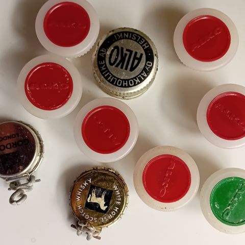 Kotimaisia ja eurooppalaisia kuvissa olevia pullon korkkeja.Lisäksi iso kasa samoja tai huonokuntoisia korkkeja!