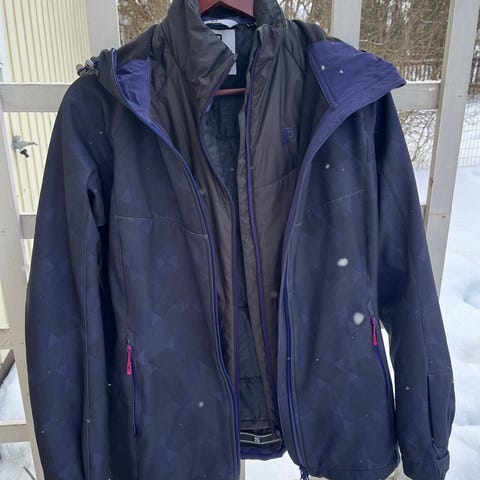 Pari kertaa käytössä ollut vuoriton musta ulkoilutakki harmailla sivuraidoilla. Edessä vetoketjulliset taskut. Postit lisätään hintaan.