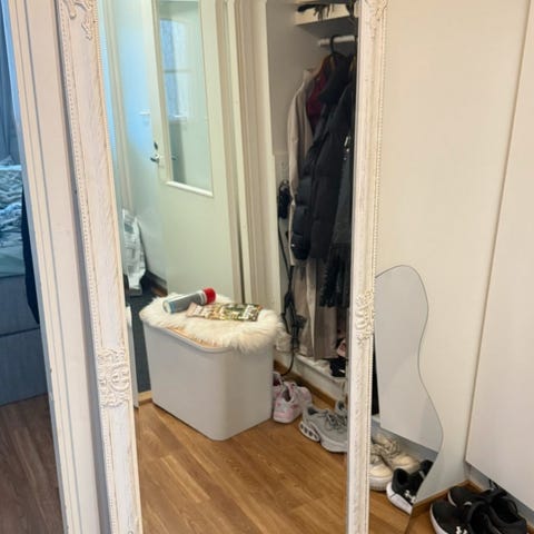 Myydään tarpeettomaksi jäänyt iso peili. Tarroja ei ole yritetty poistaa. Kehyksissä pieni kolhu yhdessä nurkassa (omasta mielestä suhteellisen huomaamaton). Mitat n.160x74cm