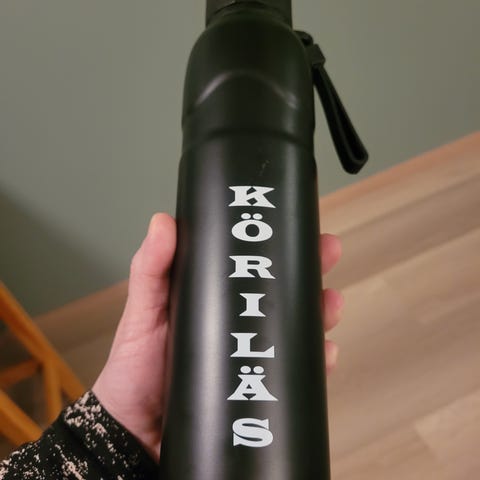 Sininen termospullo. Kierrekorkki. Tilavuus 4dl.